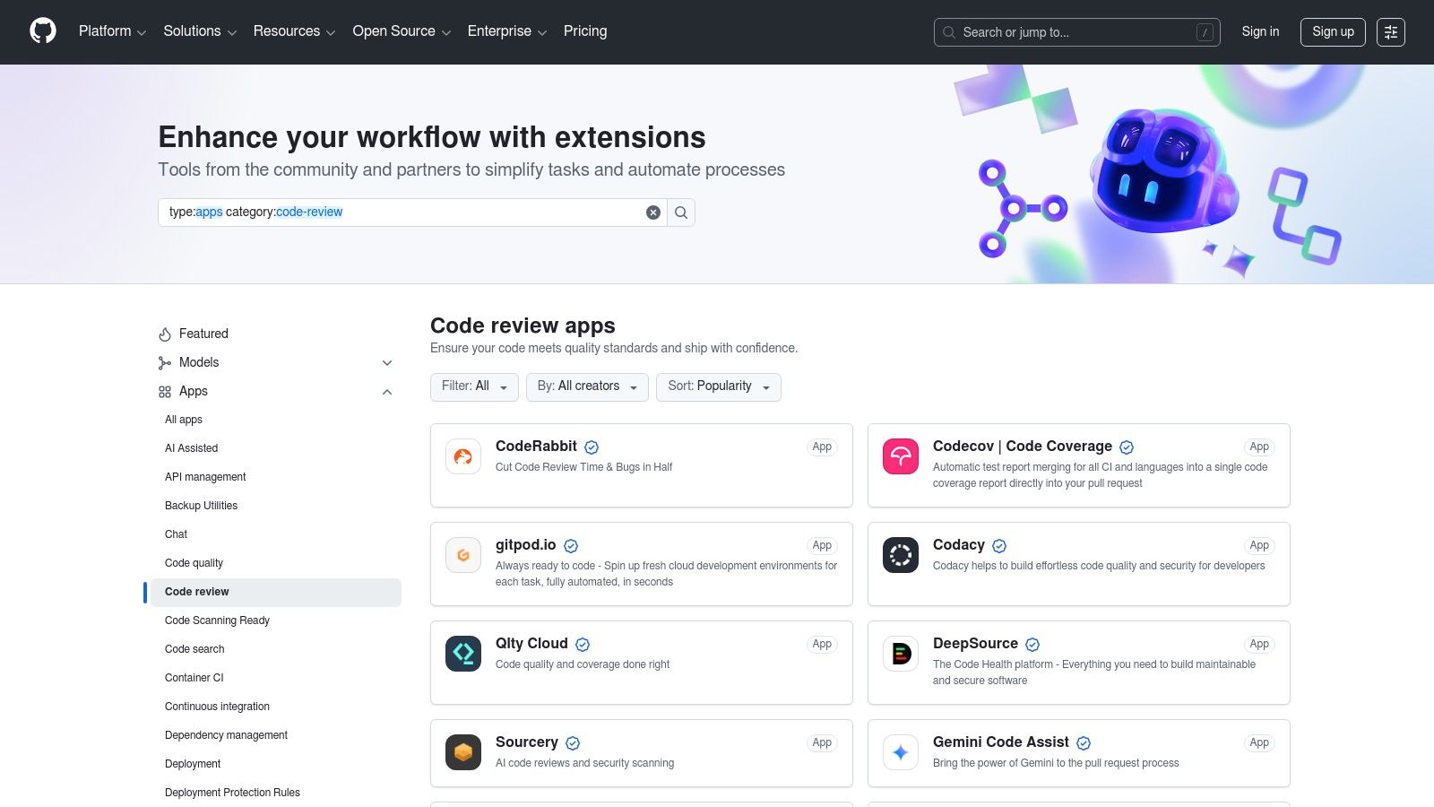 - Unique Feature: A curated, vetted catalog of installable apps and GitHub Actions, complete with user reviews and verification badges.